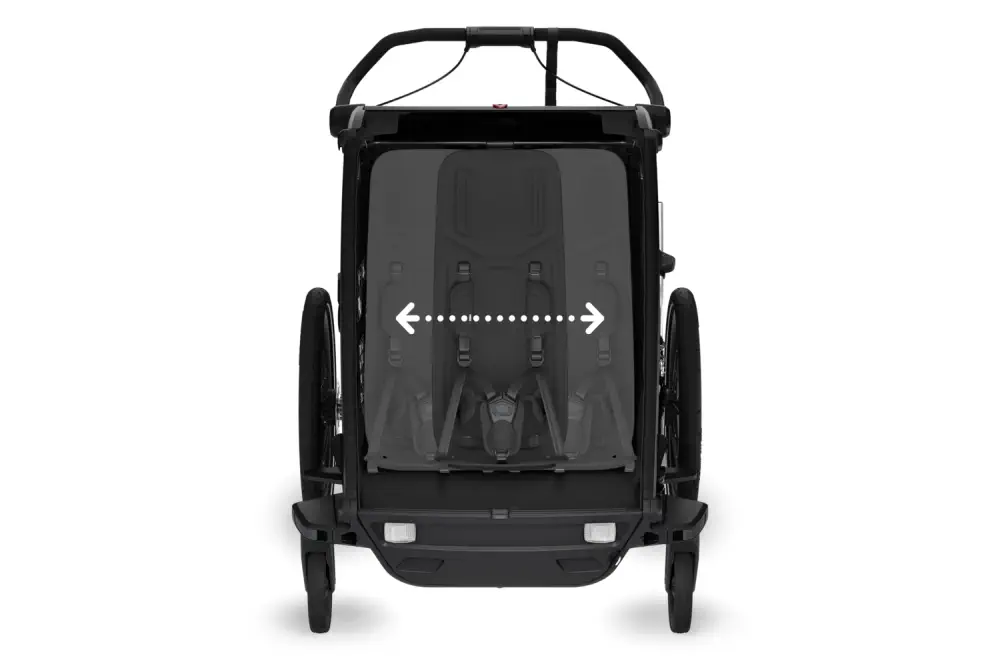 - Na modułowym siedzisku można przewozić jedno dziecko na środku lub dwoje dzieci po dwóch stronach przyczepki. Funkcja wygodnego odchylania jedną ręką i miękkie wyściełane siedziska pozwalają dzieciom wygodnie drzemać podczas przejażdżki