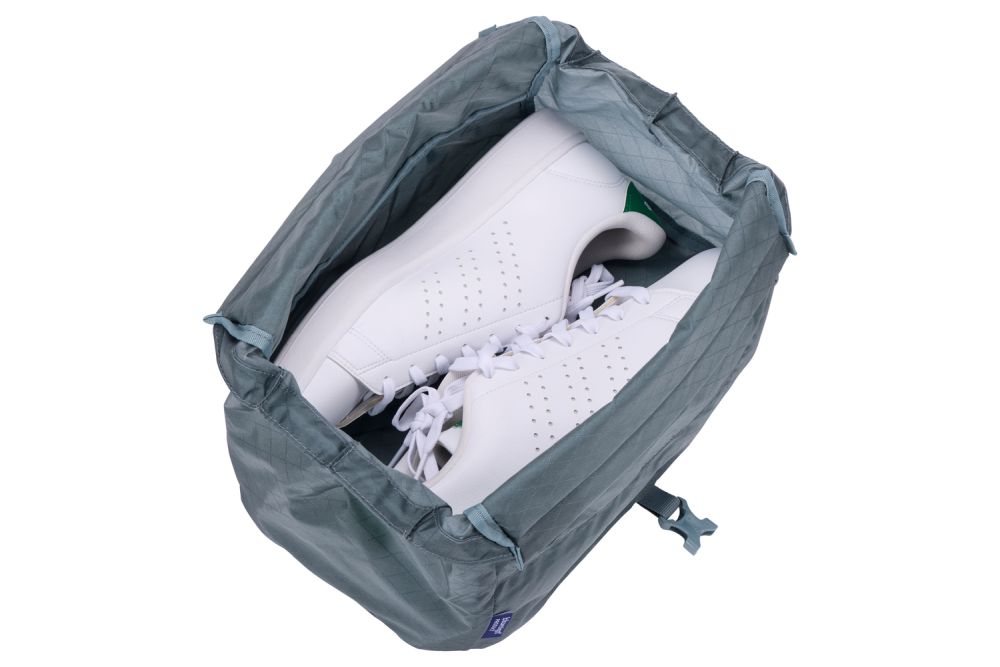 Torba na buty Thule do podróży utrzymuje buty bezpiecznie zapakowane, zapobiegając przenoszeniu brudu na czyste ubrania. Jej smukła, oszczędzająca przestrzeń konstrukcja zapewnia, że buty dobrze pasują do bagażu podręcznego.